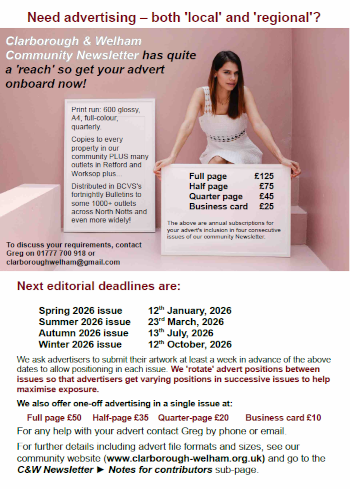 Does your business or event need advertising? Clarborough & Welham Community Newsletter has a much wider ‘reach’ than you might expect and offers exceptional value. ◄ Meet Julie for more.