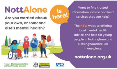 New NottAlone website offering local mental health advice and help for young people in Nottingham and Nottinghamshire, all in one place - click poster.
